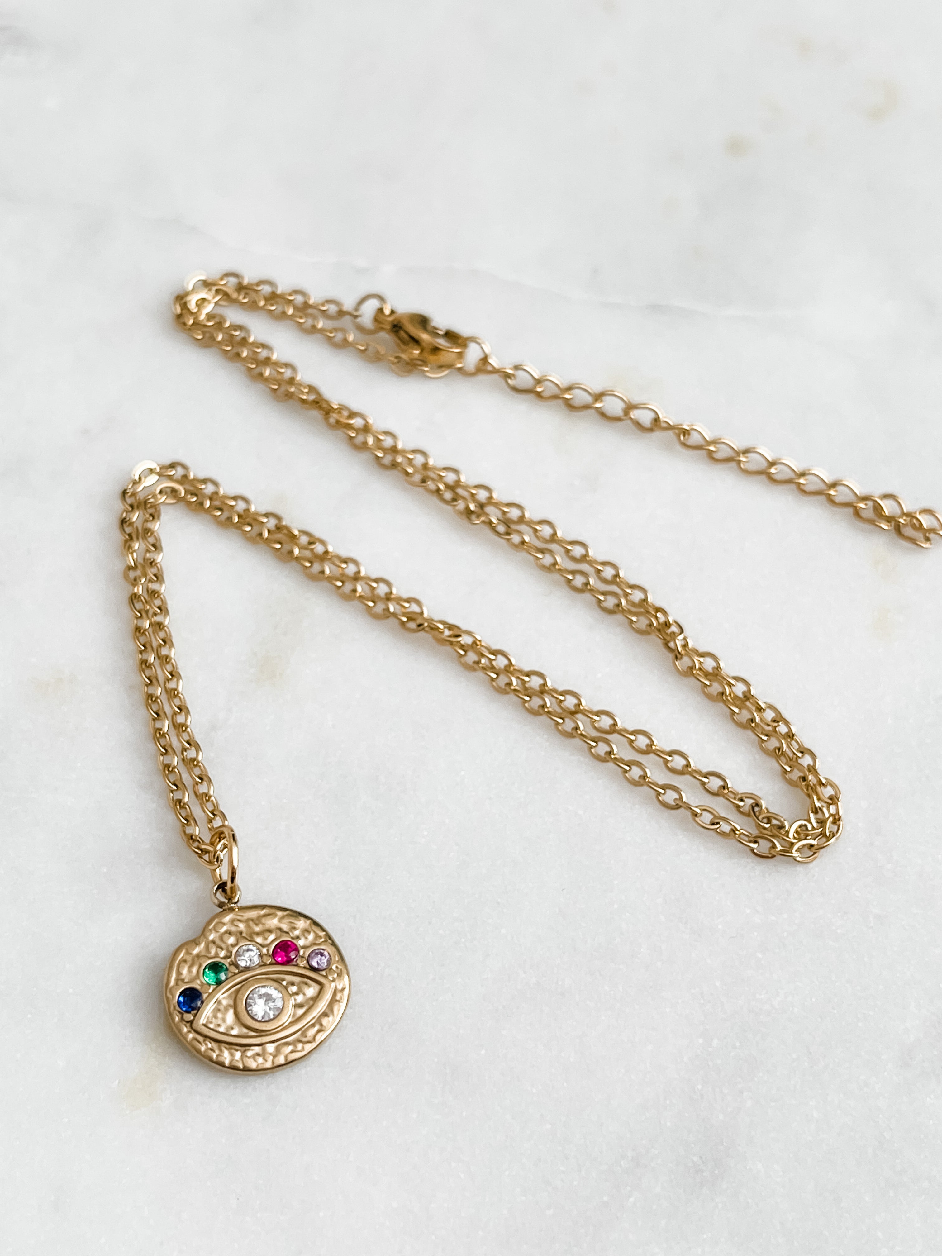 Our charm necklaces never fail to make us feel that little bit happier when we're wearing them, particularly this embellished evil eye Crown Necklace, available with rainbow or clear cubic zirconias. Made from 18k gold plated stainless steel - durable, waterproof & tarnish free.