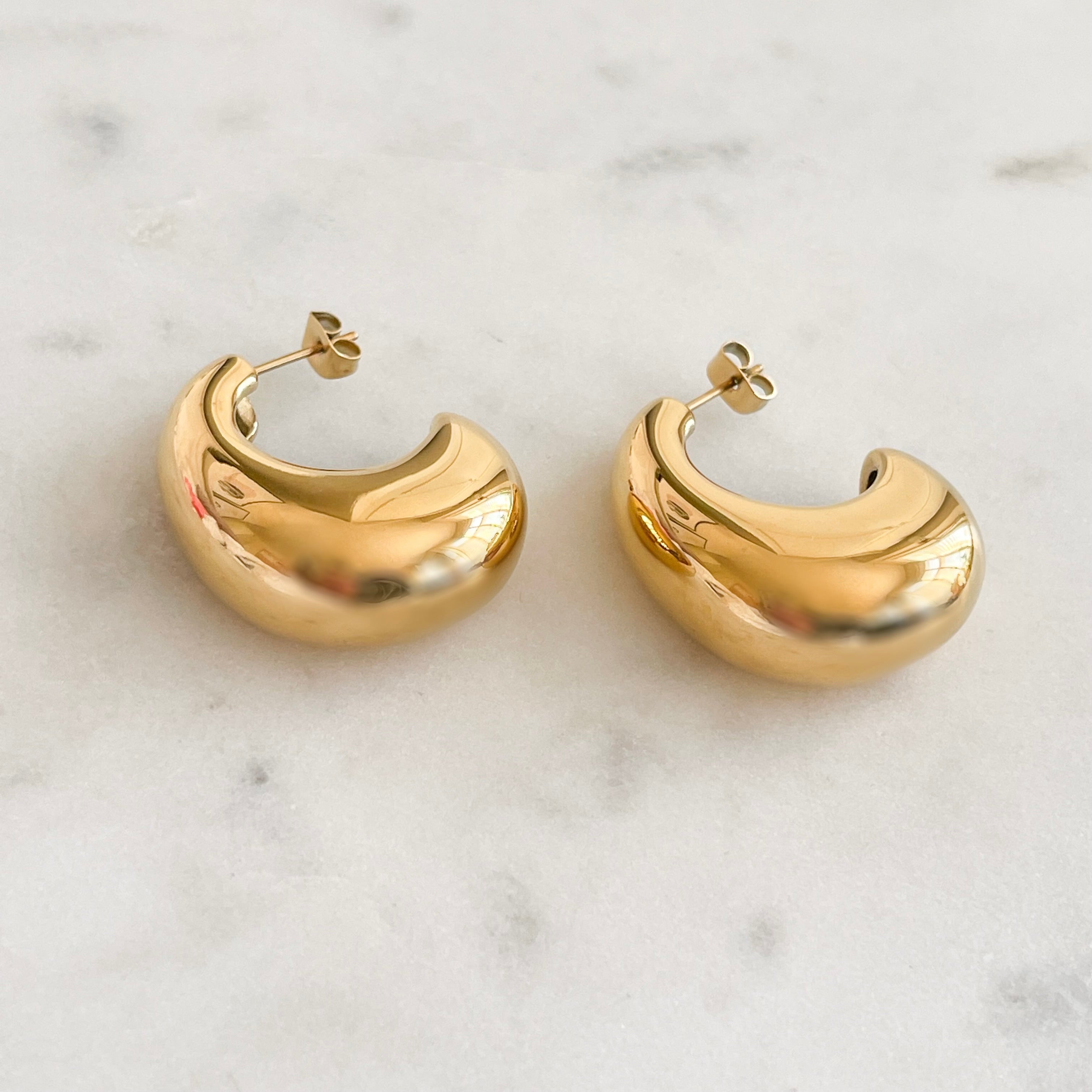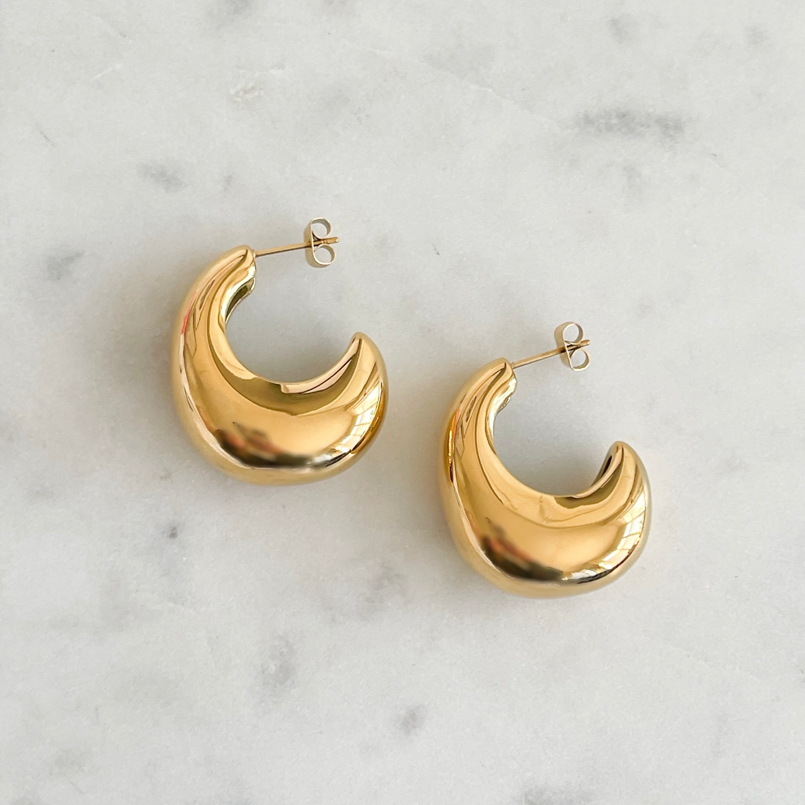 Our newest pair of statement earrings, Kenny is available in 18k gold plated stainless steel. Perfect for a sleek look.