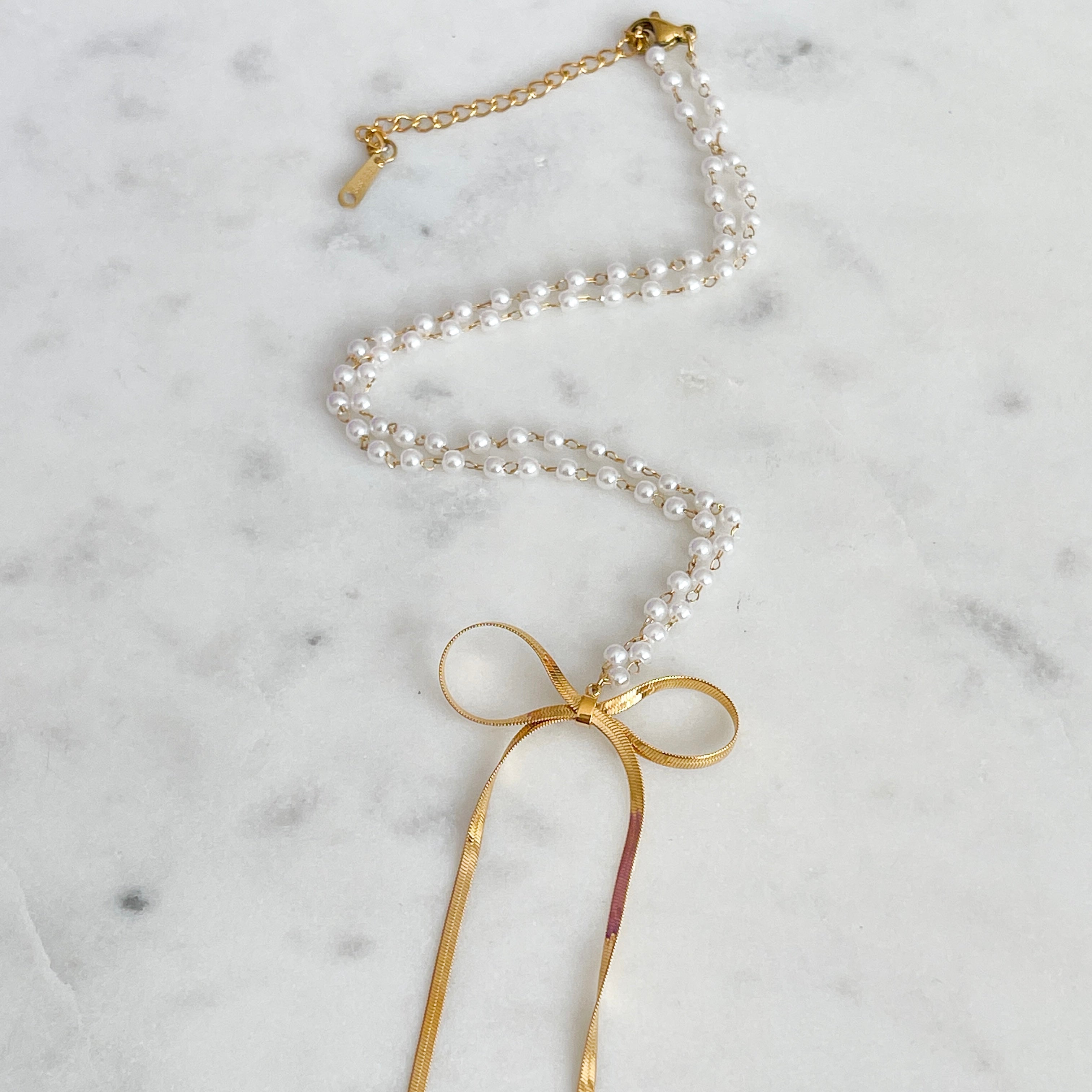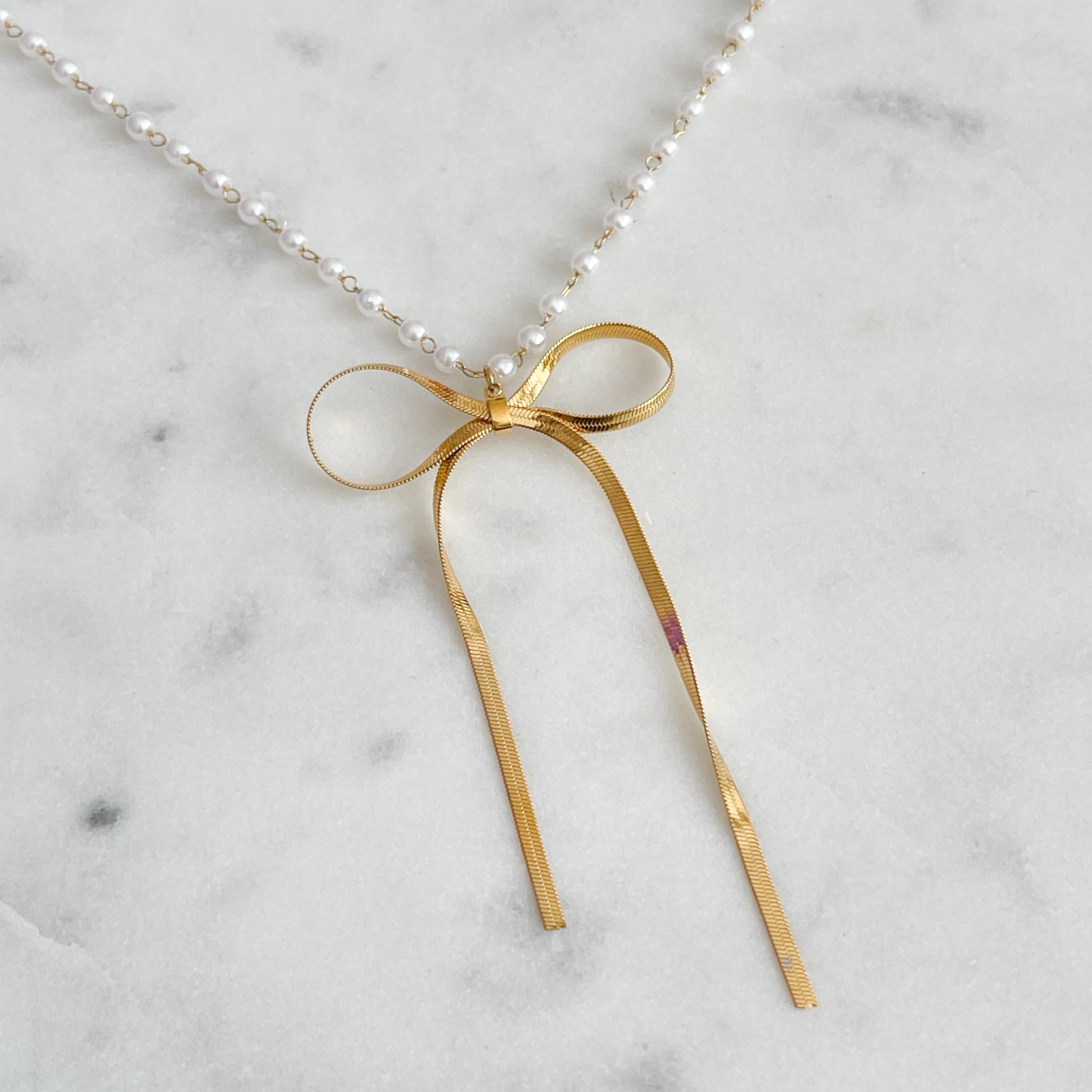 The Rosie Necklace is a fun delicate faux pearl chain with a statement gold bow, this necklace looks stunning with a classic knit. All metal components are made from 18k gold plated stainless steel, so Rosie is totally waterproof and tarnish free.