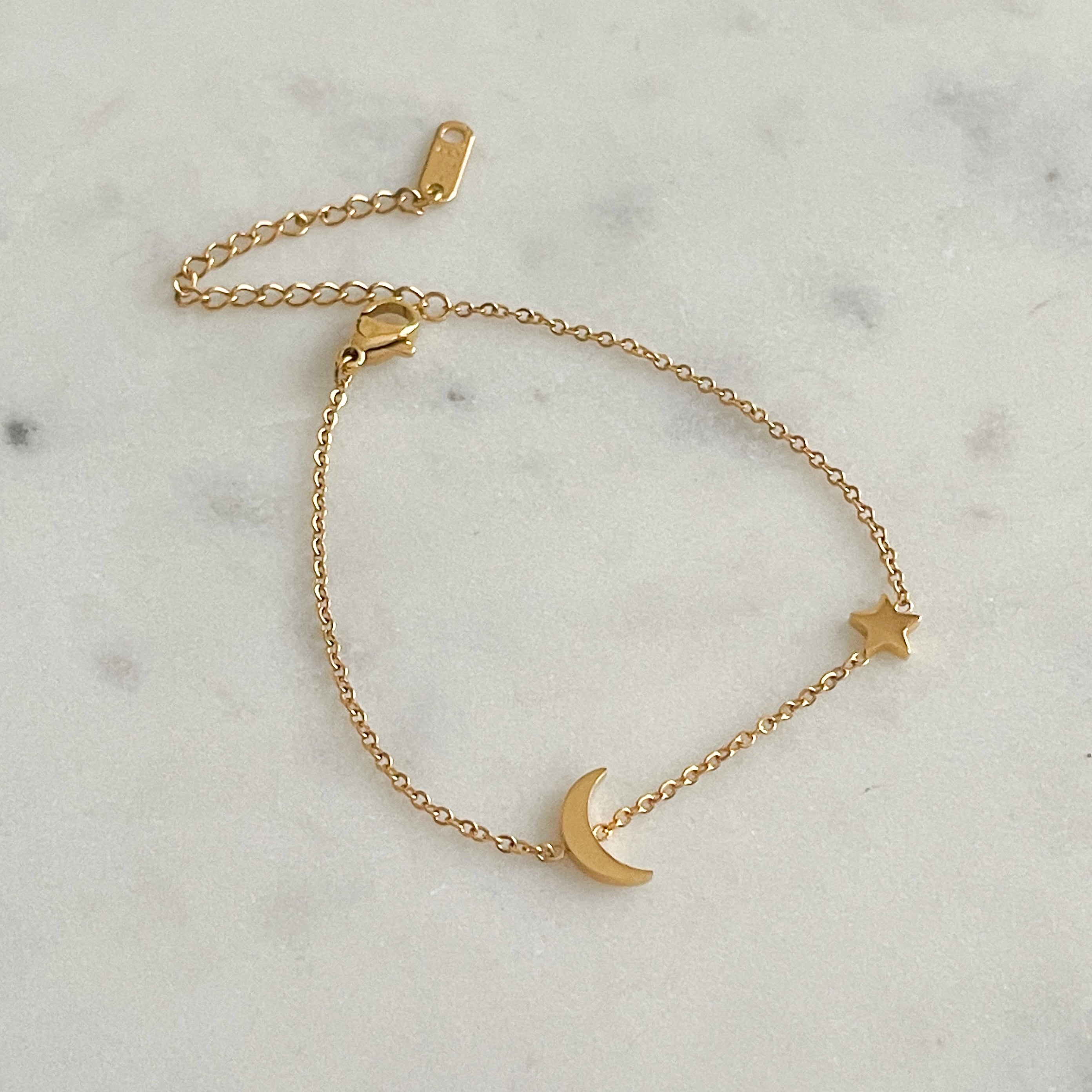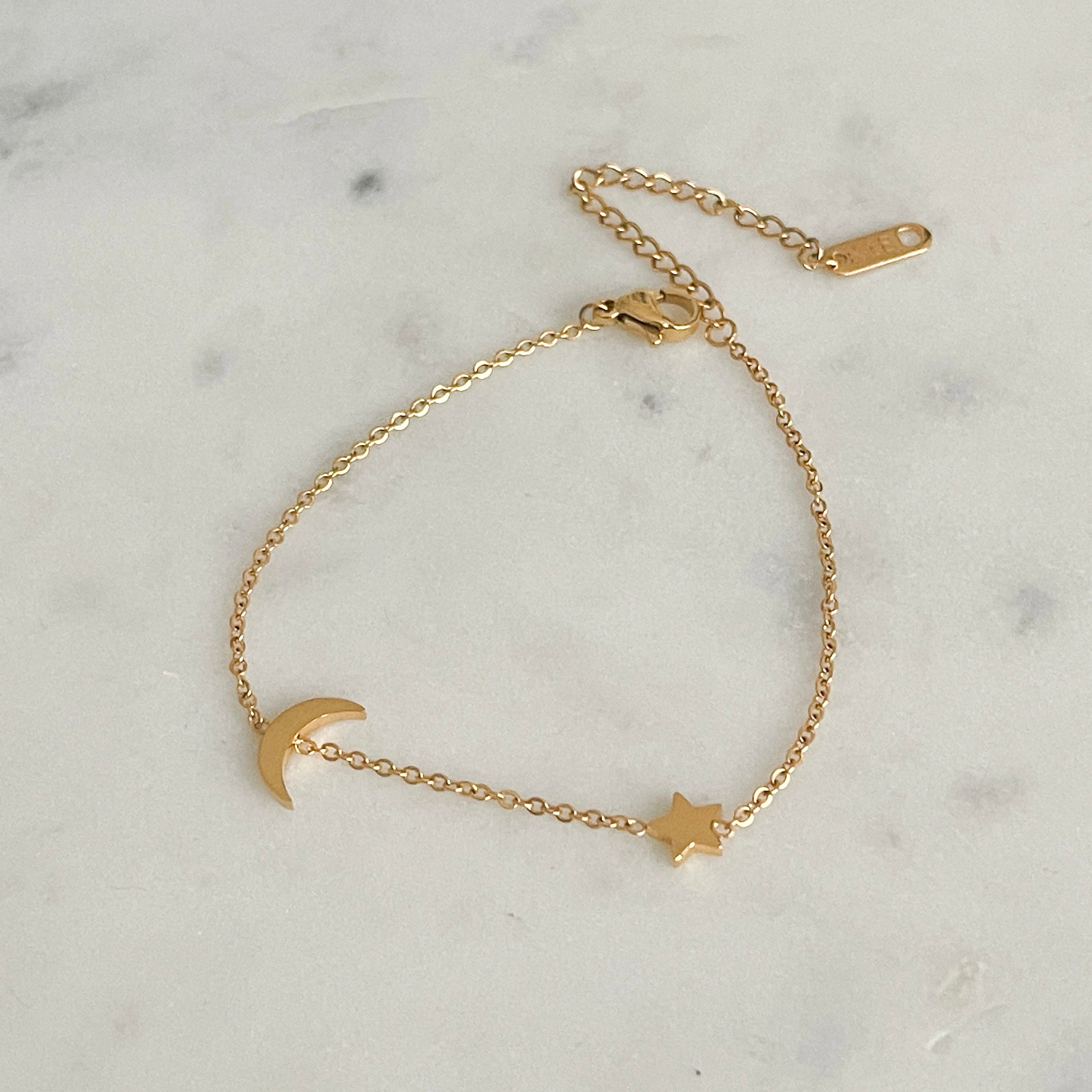 Sweet Sienna is a delicate chain featuring a solid moon and star charm. Crafted from 18k gold plating over solid stainless steel, Sienna can be worn comfortably in the knowledge that she won't tarnish or turn your skin green.