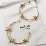 Designed in house, our Three Barb Earrings are a pair of large hoops with three fixed barbed wire charms. Made from 18k gold plated stainless steel, these earrings won’t tarnish or fade even when wet. Also available in silver tone stainless steel. This is a Break Out classic!