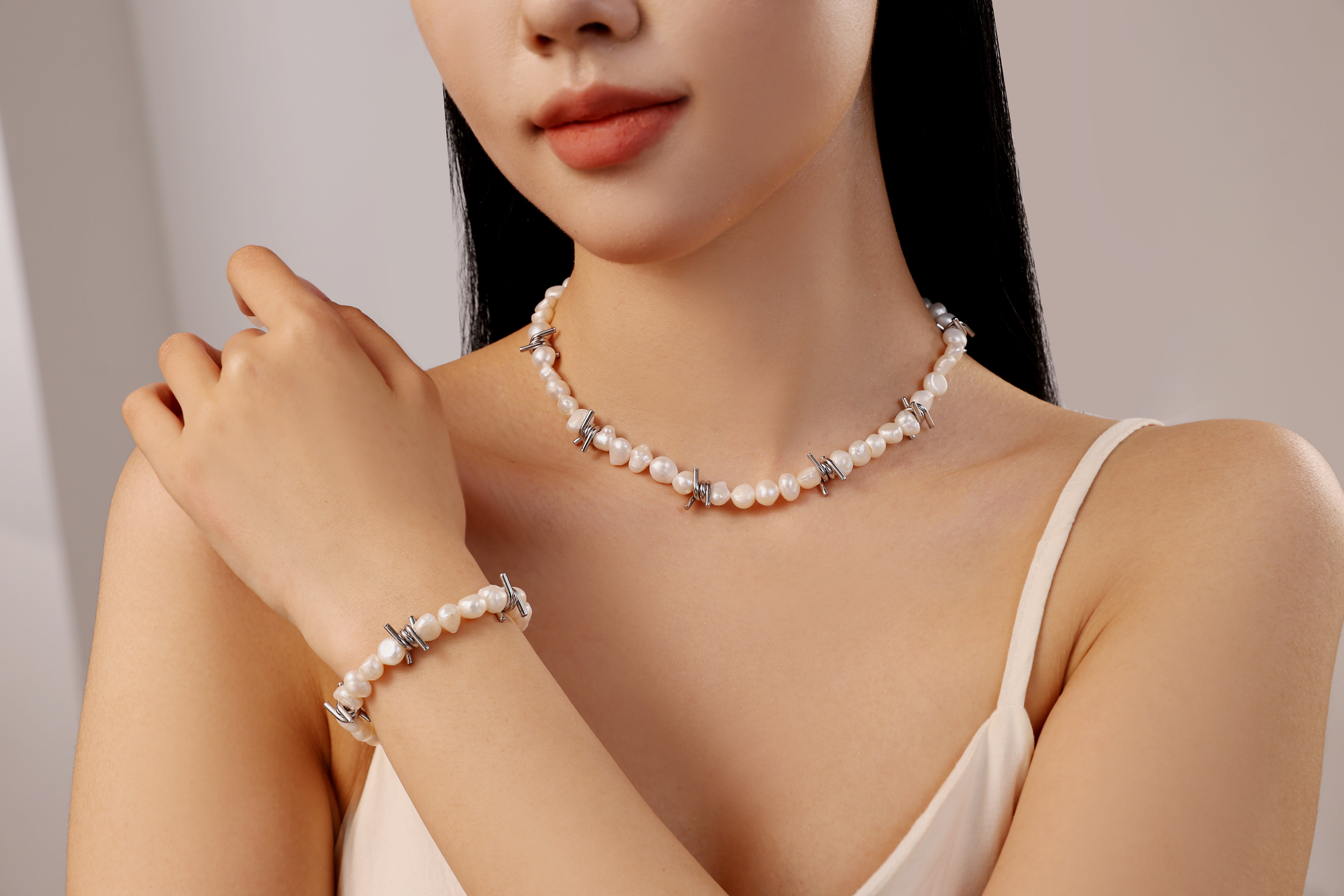 Featuring a stunning necklace and bracelet set, Jo is made of freshwater pearls interspersed with mini stainless steel barbed wire charms. Tough and sweet, Jo is also tarnish-free and waterproof.