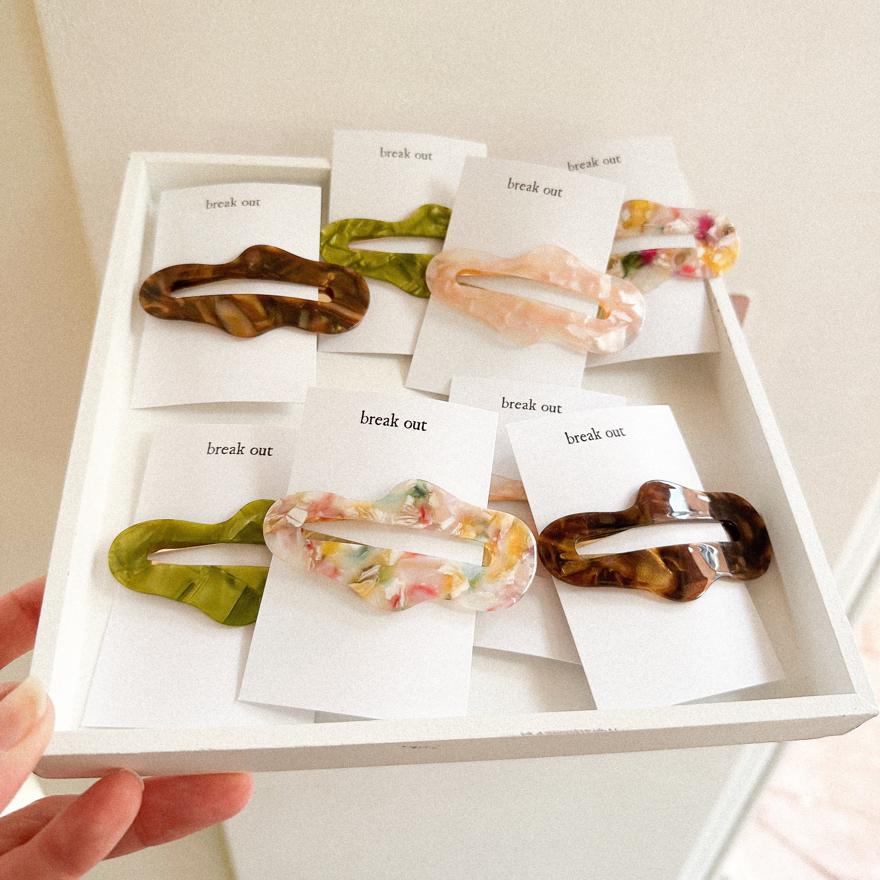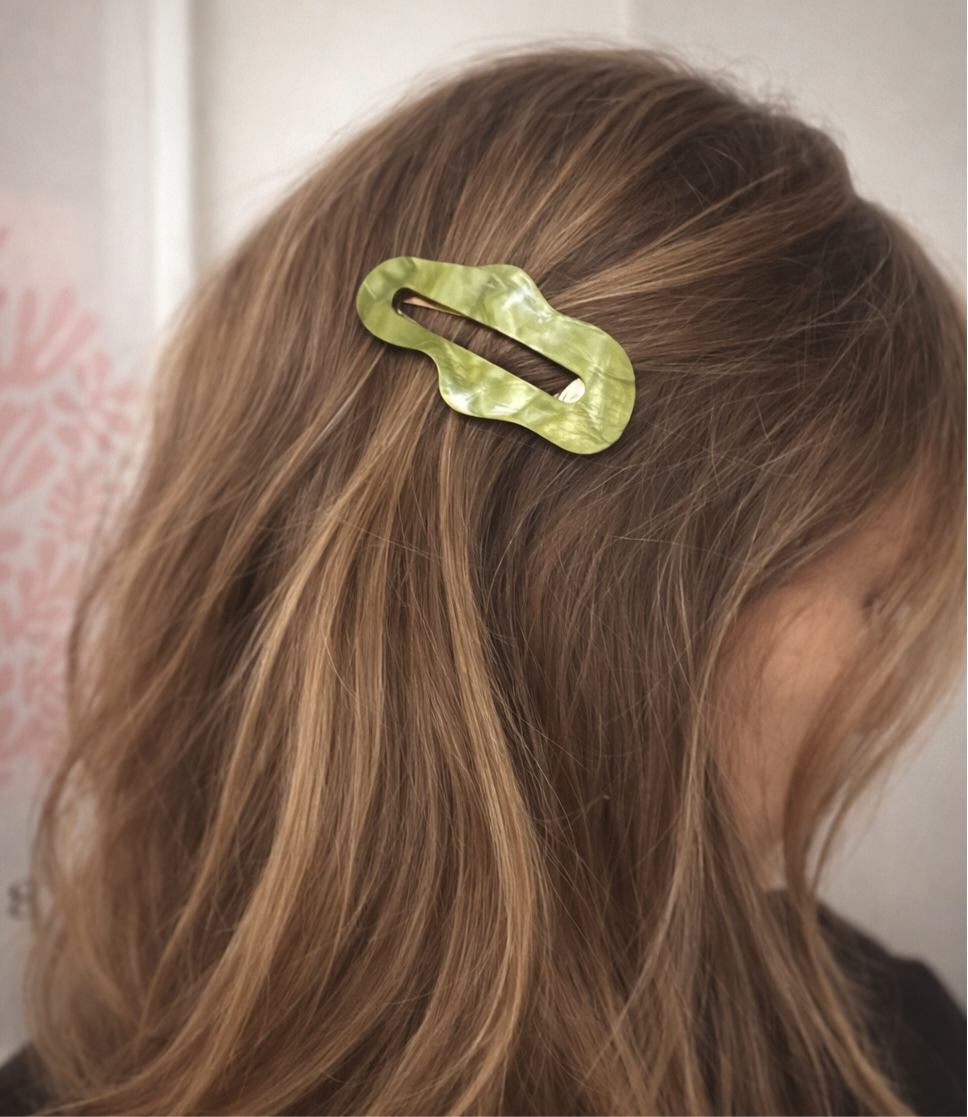 Made from acetate and available in 4 colours (brown, green, pink and a dreamy multi), these large clips feature a snap closure and secure grip.